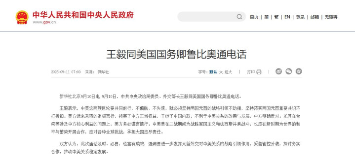紧随其后,美国国务卿鲁比奥也与中国外长王毅通了话。