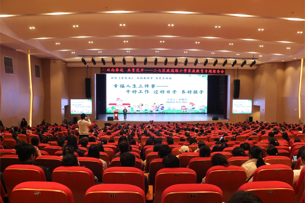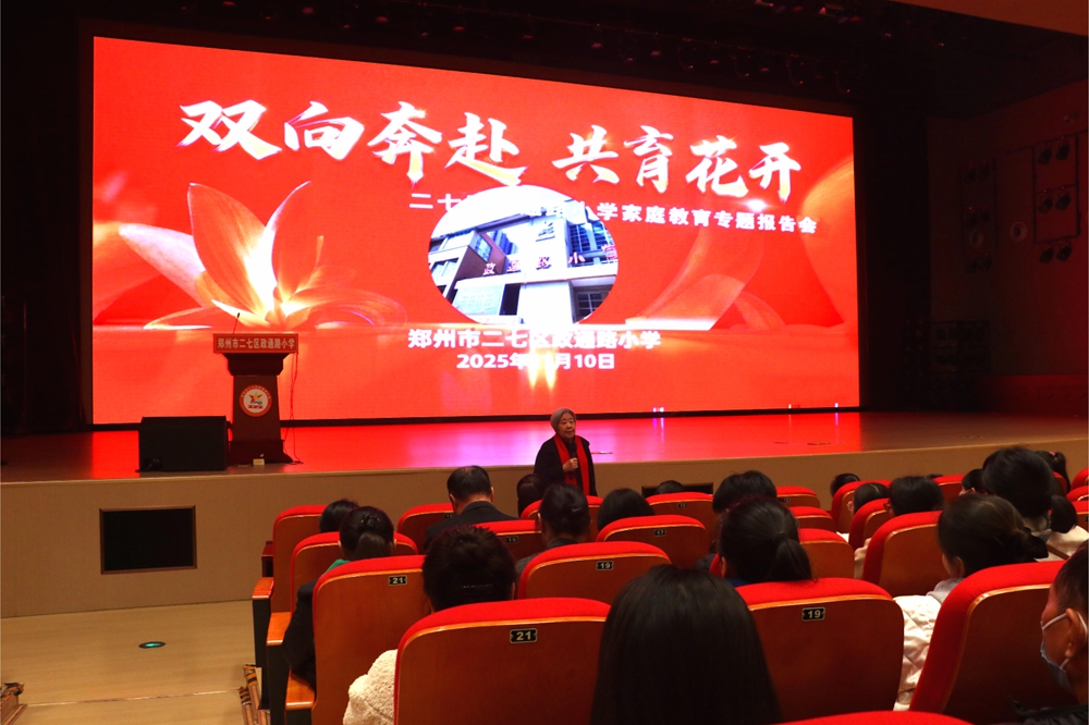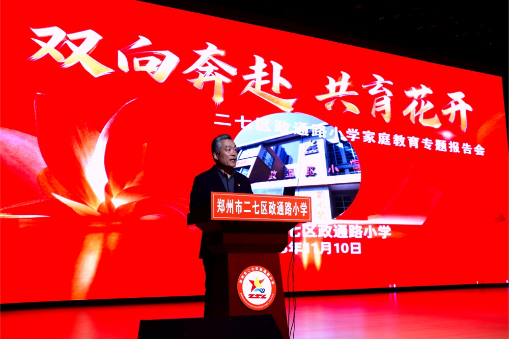 家庭教育作为家庭功能的核心之一,更是孩子成长的“第一课堂”,直接影响着孩子的习惯养成与未来发展。为搭建家校沟通桥梁、提升家长科学育儿理念,助力一、二年级学生平稳适应小学生活,11月10日,郑州市二七区政通路小学以“双向奔赴 共育花开”为主题,特邀全国“家庭教育工作先进个人”、全国“事迹特别感人的百姓学习之星”、全国教育系统关心下一代工作先进工作者、河南省首届“最美志愿者”、河南省首批青少年德育宣讲优秀专家、郑州市二七区人大代表、郑州市关工委副主任、郑州市教育局关工委关爱工作专家团团长周慧玲老师为一二年级家长作家庭教育专题报告会。二七区关工委副主任黄晓江,二七区教育局关工委主任张俊航参加报告会,活动由学校副校长罗琳主持。
